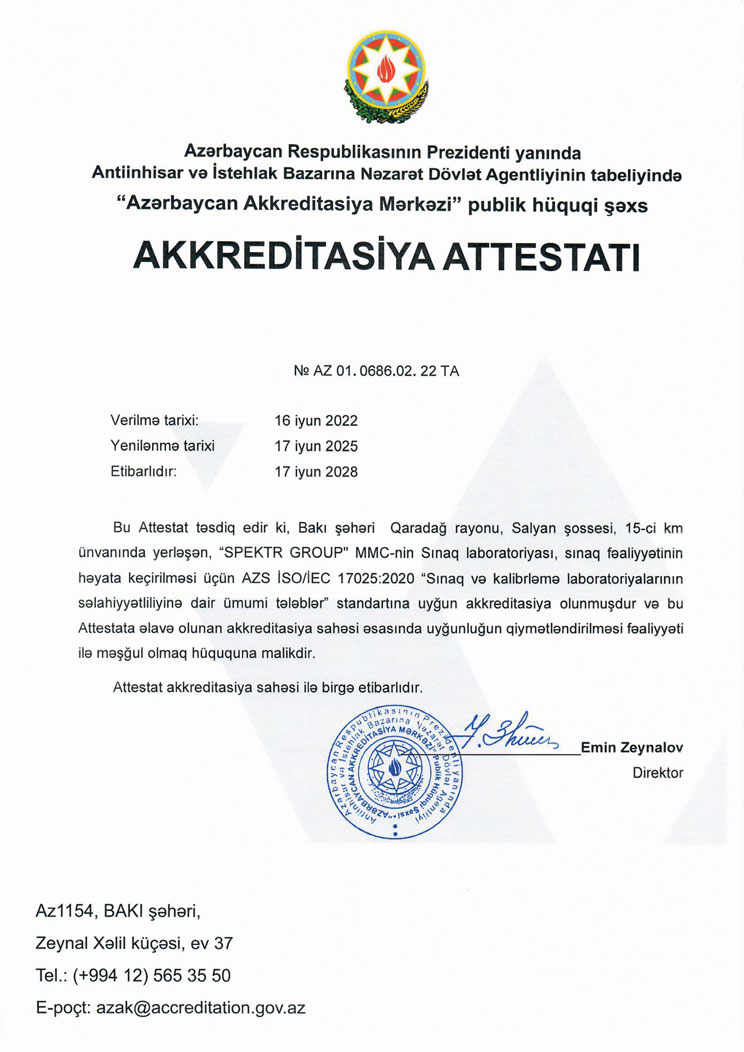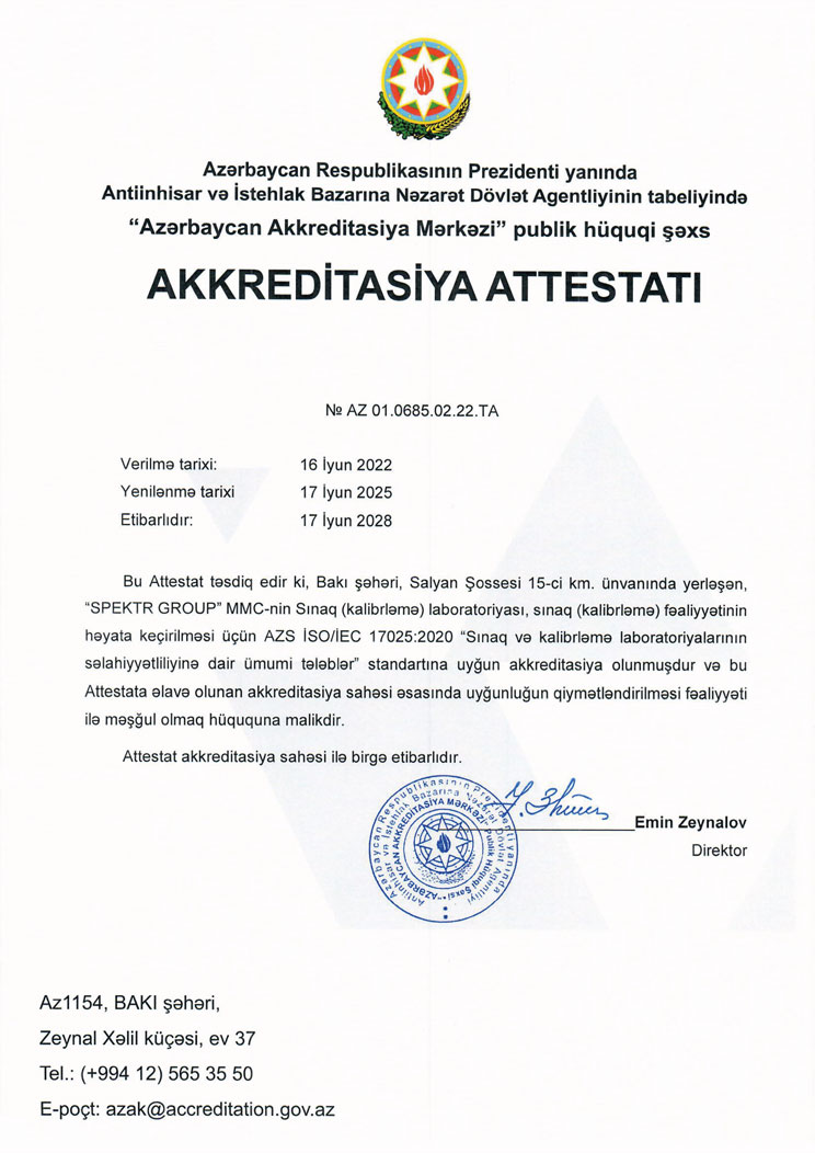 ISO/IEC 17025:2020 (Accreditation for Calibration Services) – Accreditation Body: Azerbaijan Accreditation Center